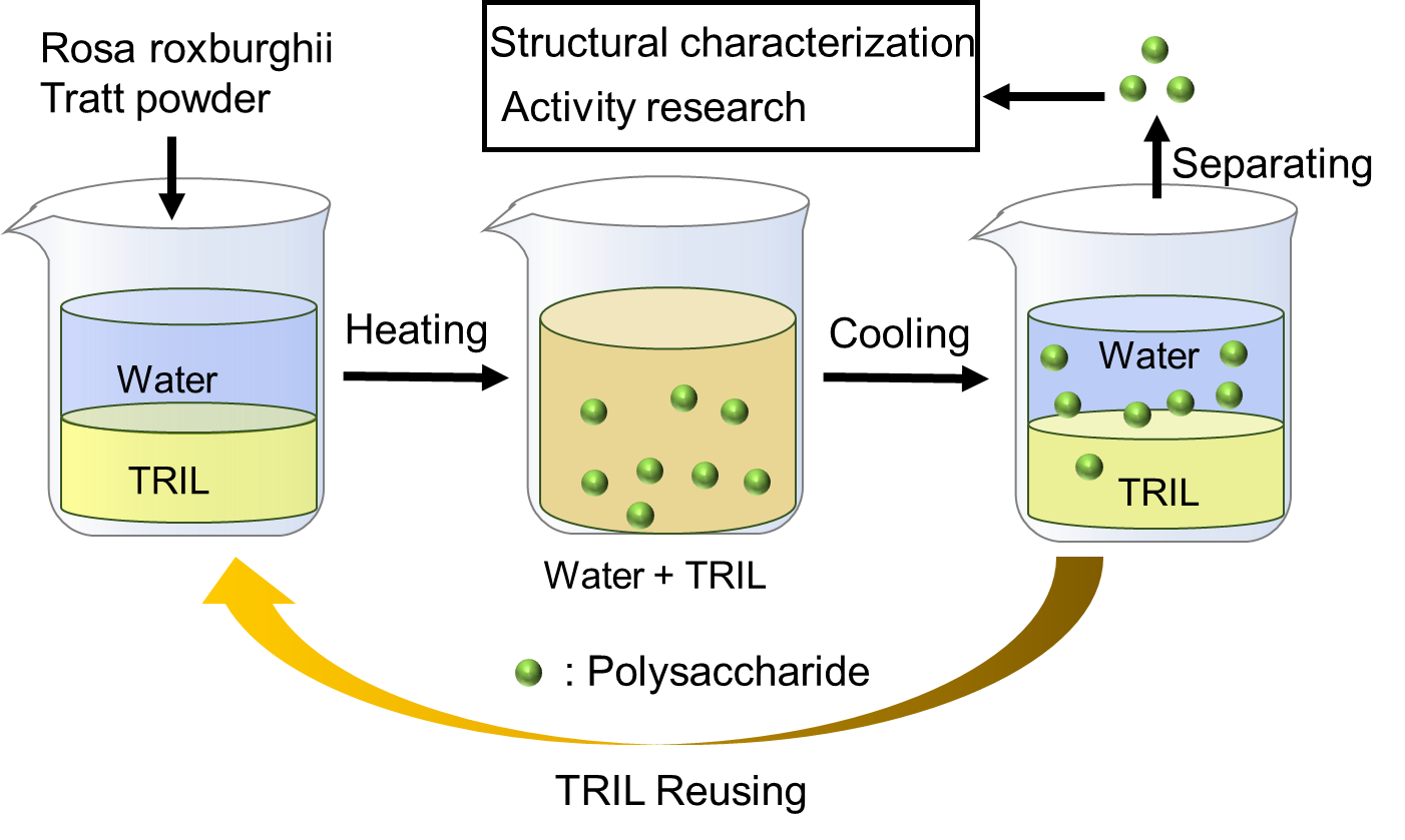 响应型离子液体可以通过改变环境条件实现状态切换,从而实现回收再利用以减少对环境的影响。本研究合成了十种温度响应型离子液体并应用于刺梨多糖的萃取和分离。该温度响应型离子液体能实现多糖高效萃取,并且可以对萃取剂进行回收再利用。后续纯化得到三个多糖组分,表现出较高的抗氧化活性。本研究为从天然产物中绿色提取活性成分提供了技术支持,使其在食品和医药领域功能性多糖开发方法具有重要的应用前景。