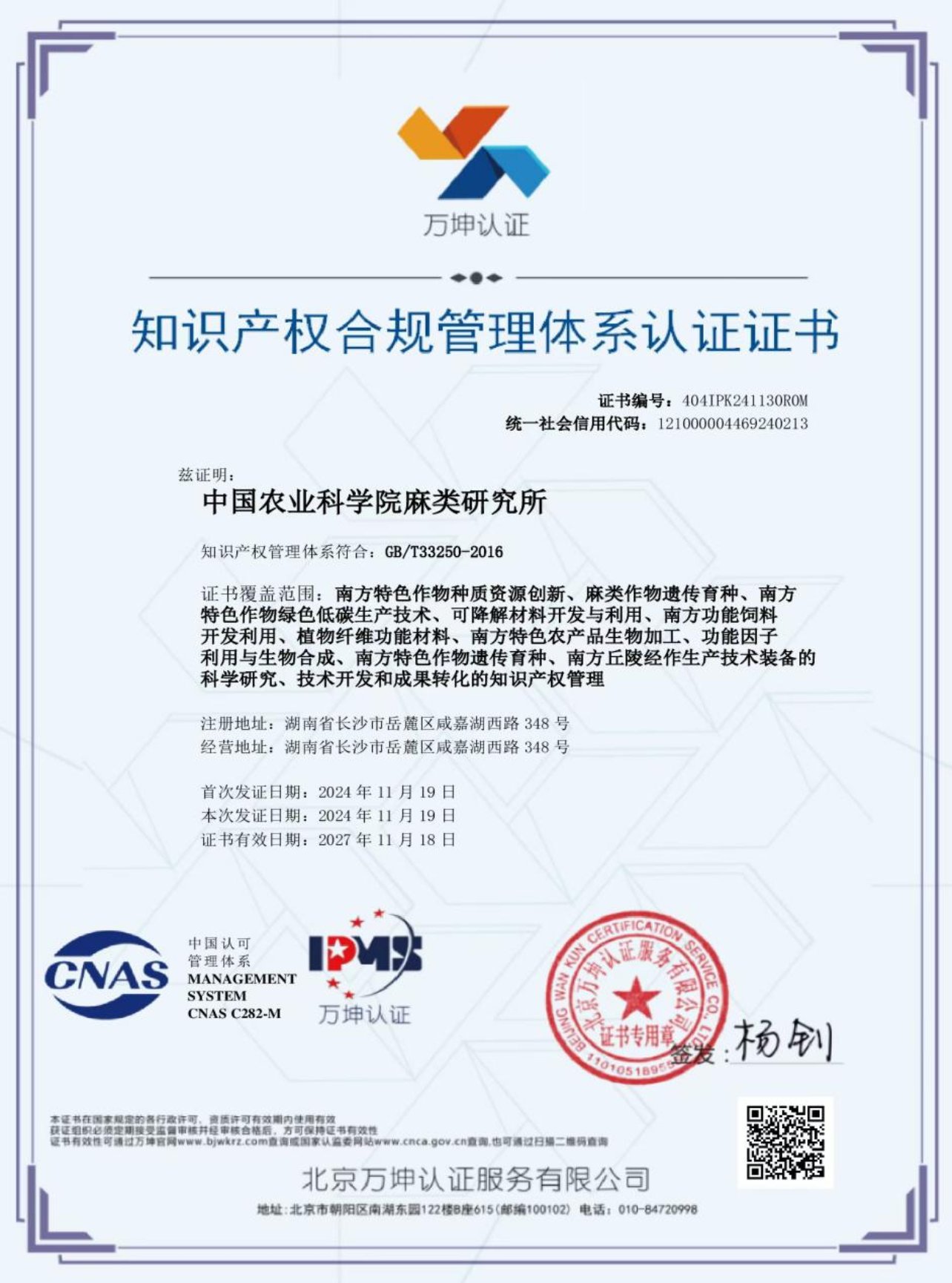 近年来,中麻所积极推进知识产权管理以及专利转化应用工作并取得了重要成绩,建立了规范化知识产权管理体系,通过了国家知识产权贯标认证及知识产权管理体系监督审核,并获批了湖南省专利转化应用专项项目,建立了湖南省和中国农业科学院第一家科研机构知识产权中心,并被湖南省知识产权局推荐国家知识产权强国建设示范科研机构。